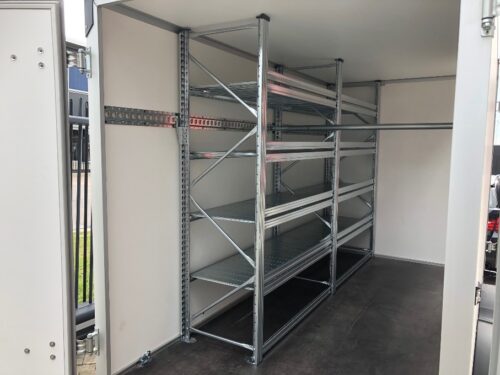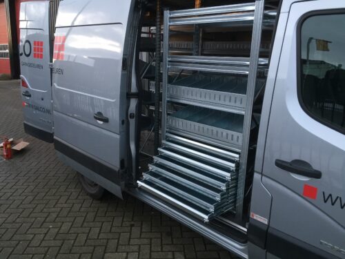 Ja, wij werken met dezelfde legbordstellingen die ook in onze magazijnprojecten worden toegepast. Hierdoor zijn accessoires zoals bakken, verdeelschotten, lades en veiligheidsvoorzieningen onderling uitwisselbaar. Dat maakt ons systeem modulair, duurzaam en eenvoudig aan te passen als je werkzaamheden veranderen of je wagen wordt vervangen.
