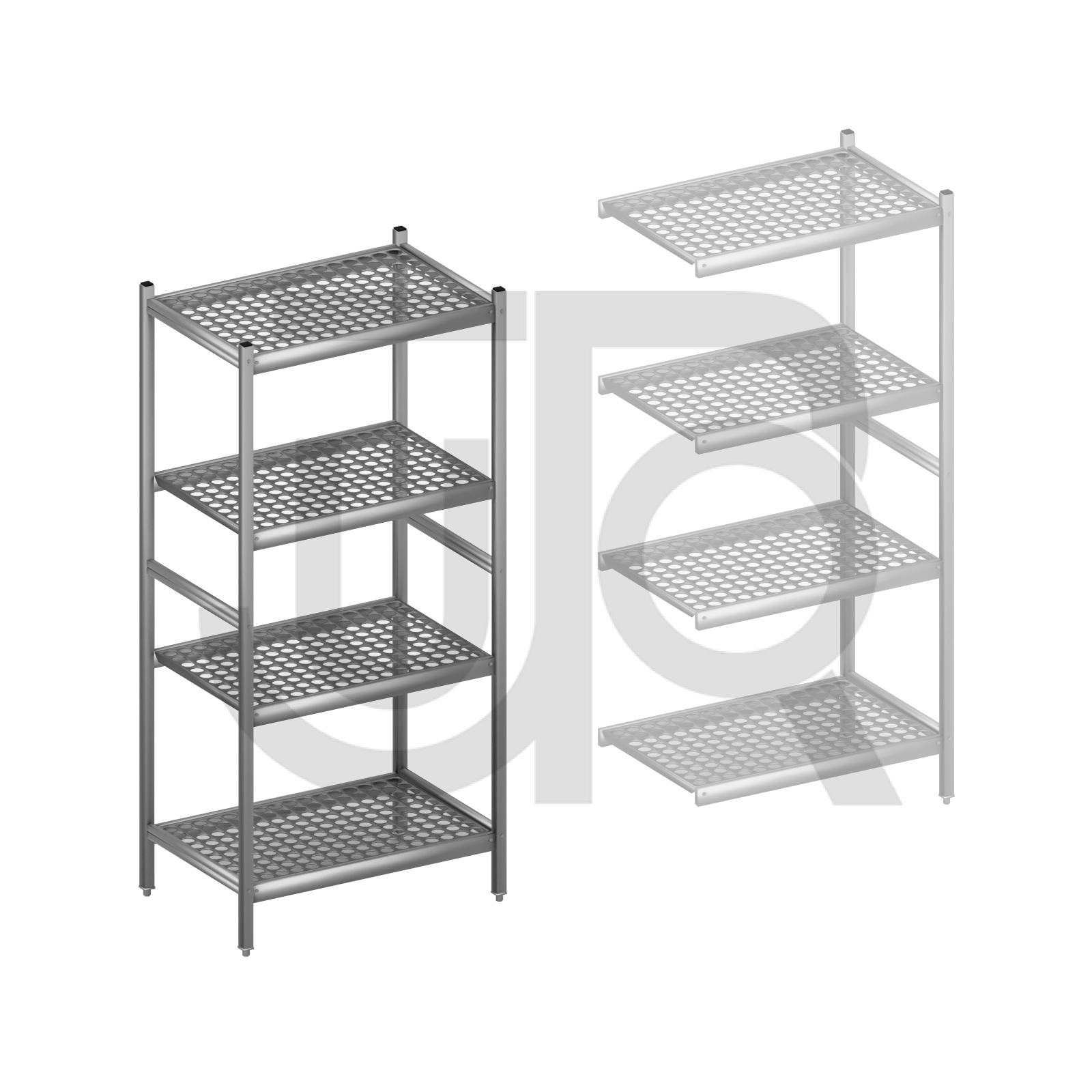 Bestaande uit : 2 staanders en 4 etage’s; voorzien van uitneembare kunststof legborden