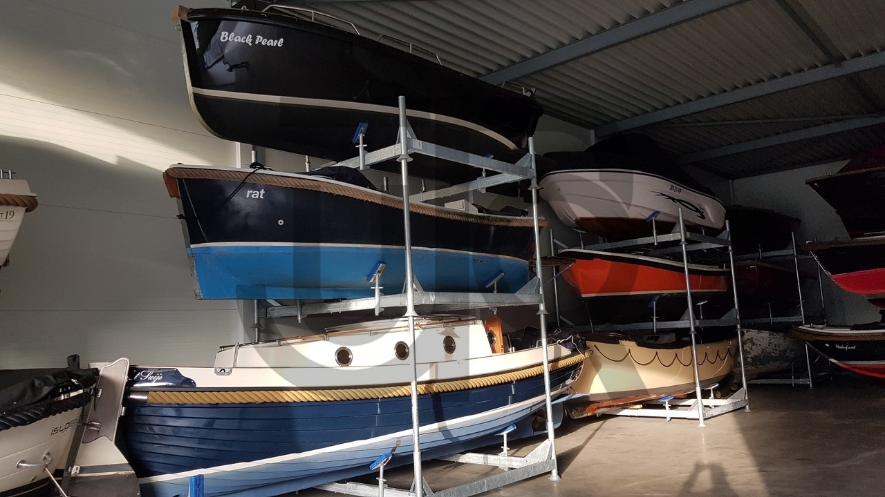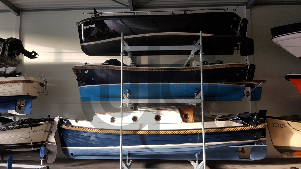 Onze stapelbare bootbokken zijn volbad verzinkt uitgevoerd en voorzien van 4 traploos instelbare spindelsteunen met NON Stripe kussens.