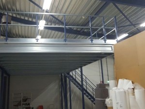 De standaard entresolvloer is opgebouwd uit kolommen, kinderbalken en 38 mm brandvertragende vloerpanelen, inclusief leuningwerk, trap en kantelhek.