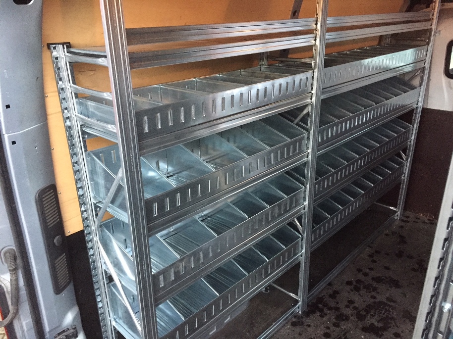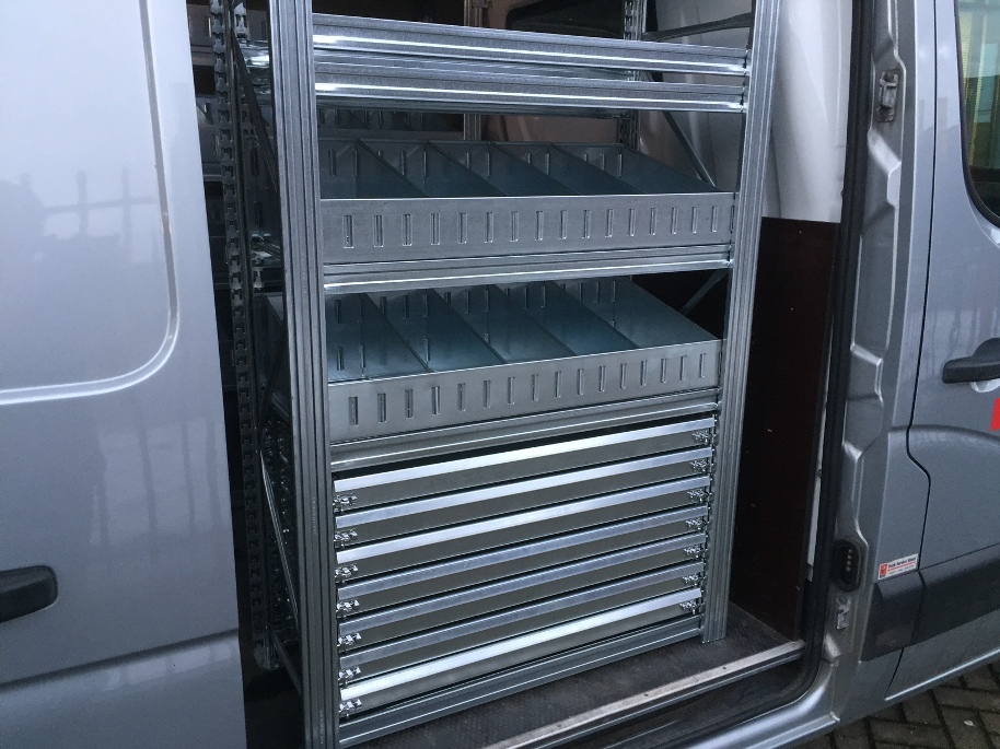 Denk hierbij aan kleine onderdelen en bevestigingsmaterialen. De inrichting is uitgevoerd met Unirack legbordstellingmateriaal. Bij dit type stelling zijn de staanders opgebouwd uit stijlen voorzien van schoren welke met een bout-moer verbinding zijn bevestigd. Aan de bestuurders en bijrijderszijde zijn vakken opgebouwd met een diepte van 320mm. De totale netto lengte van de opstelling aan de bestuurderszijde is 2.630mm. Aan de bijrijderszijde staat er een vak boven de wielkast, met een netto breedte van 1.270mm. De indeling bestaat uit 3 niveaus met opzetranden voorzien van schuine verdeelschotten en 1 niveau voorzien van opzetranden met rechte verdeelschotten.