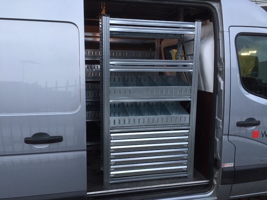 Deze bedrijfswagen is voorzien van een zéér uitgebreide inrichting met veel vakken voor het vervoeren van klein materiaal welke tijdens de montagewerkklussen nodig kunnen zijn. Denk hierbij aan kleine onderdelen en bevestigingsmaterialen.